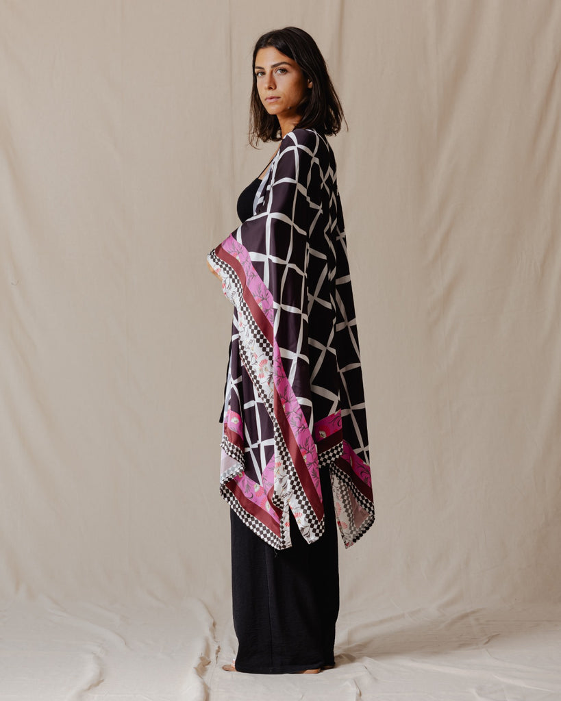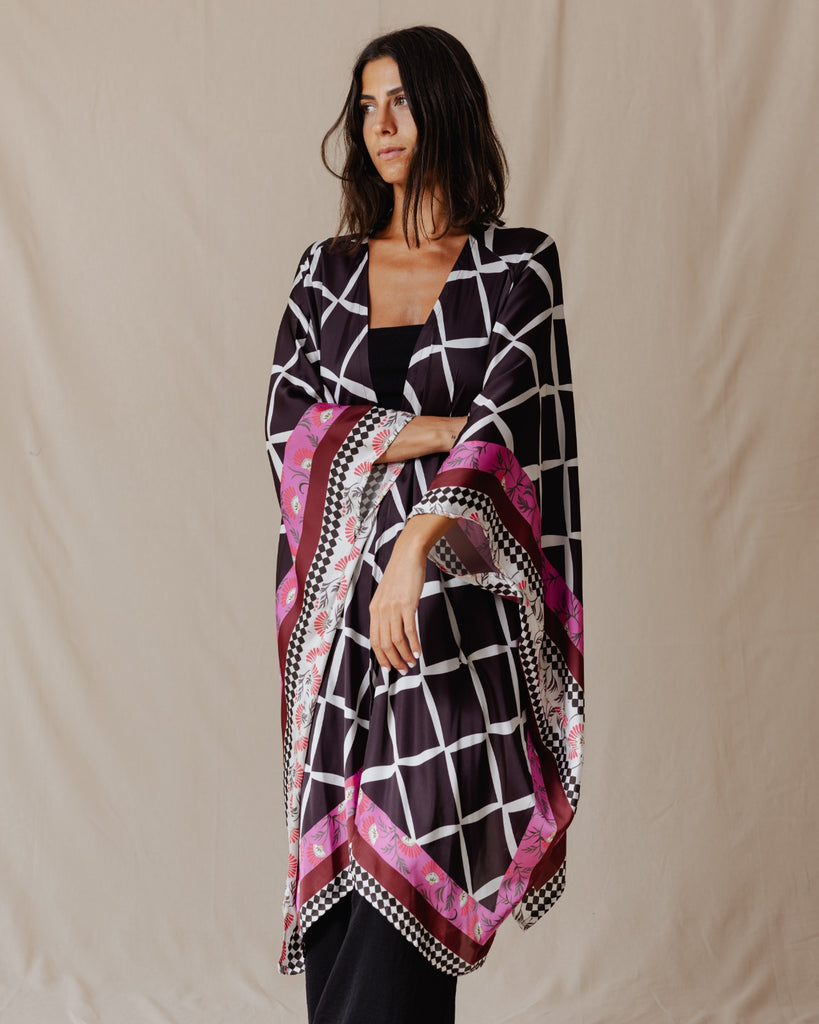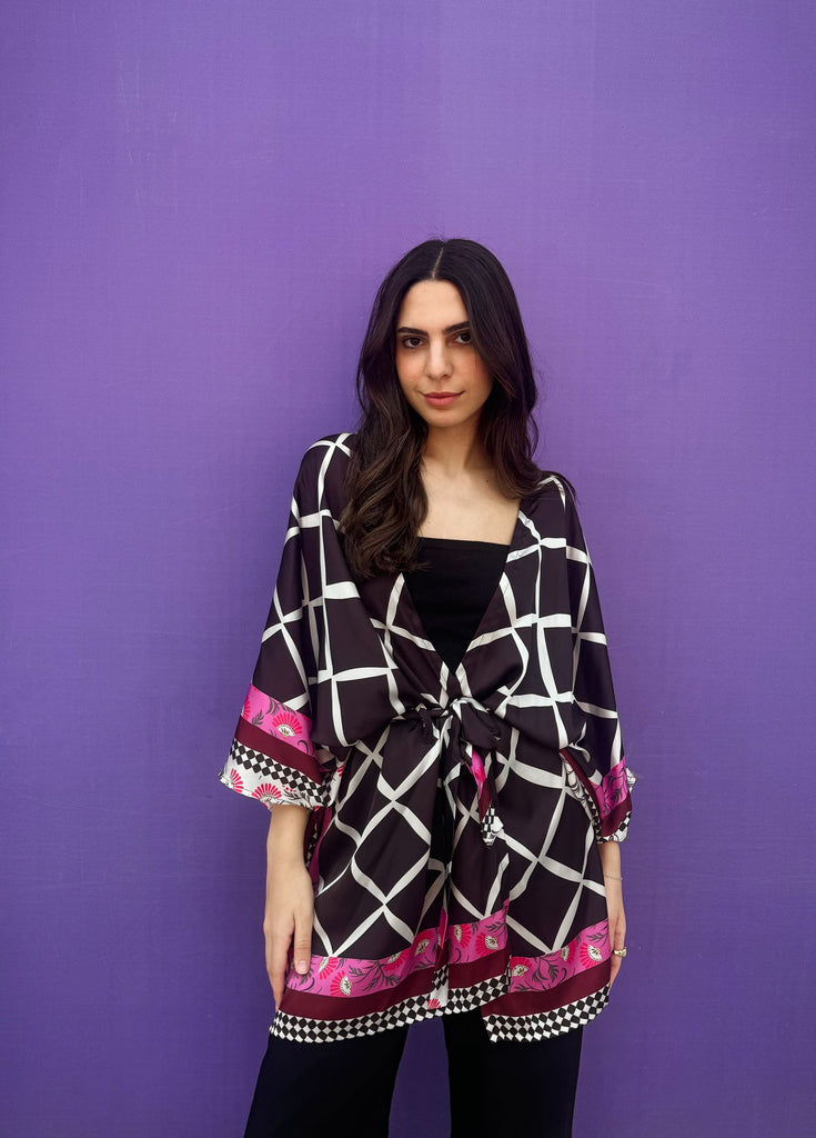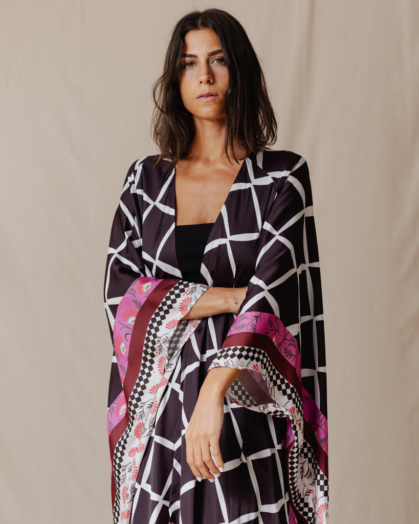 Step into glamour with our satin printed kimono, designed to turn heads wherever you go.