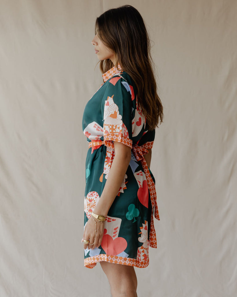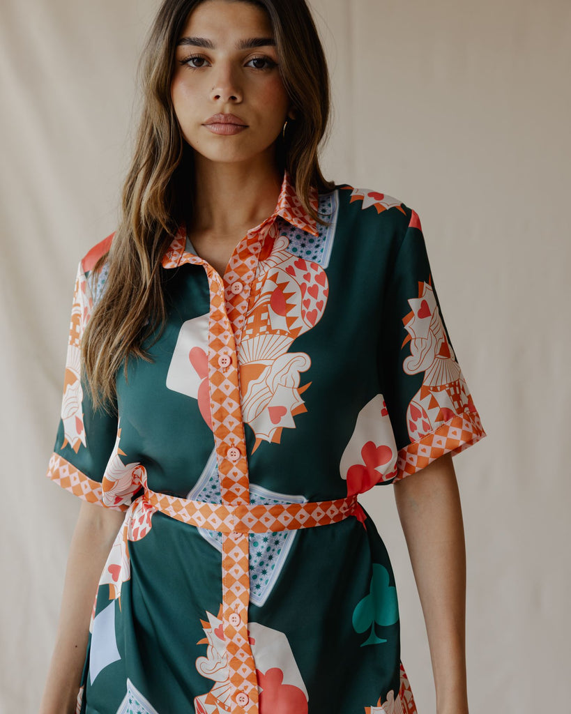 This playful shirt dress features a bold card-themed print, button-down front, and a matching belt for a flattering fit. Made from soft, lightweight fabric, it’s perfect for adding a fun twist to your casual wardrobe.