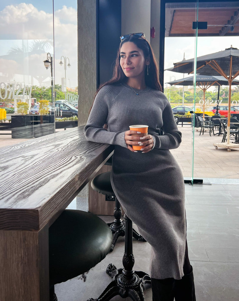 Effortless elegance: Our Daring knitted dress with a flattering side slit delivers comfort and style, Available in 3 colors.