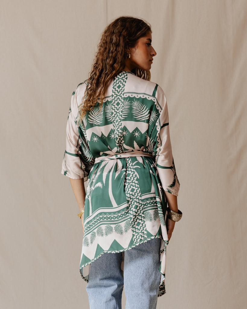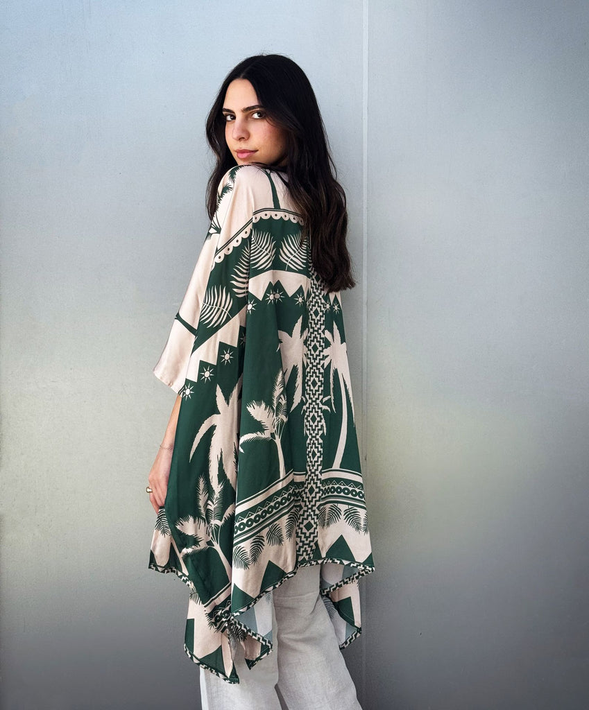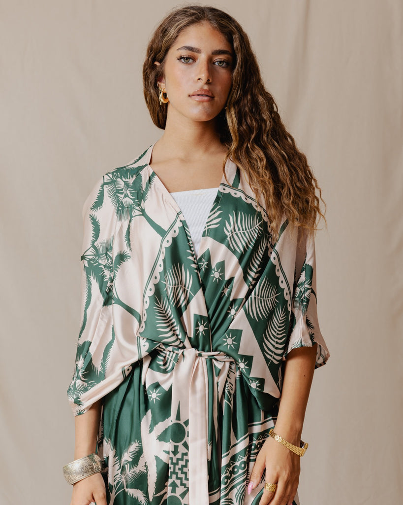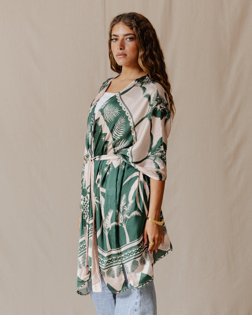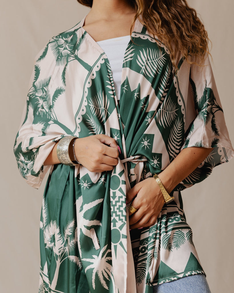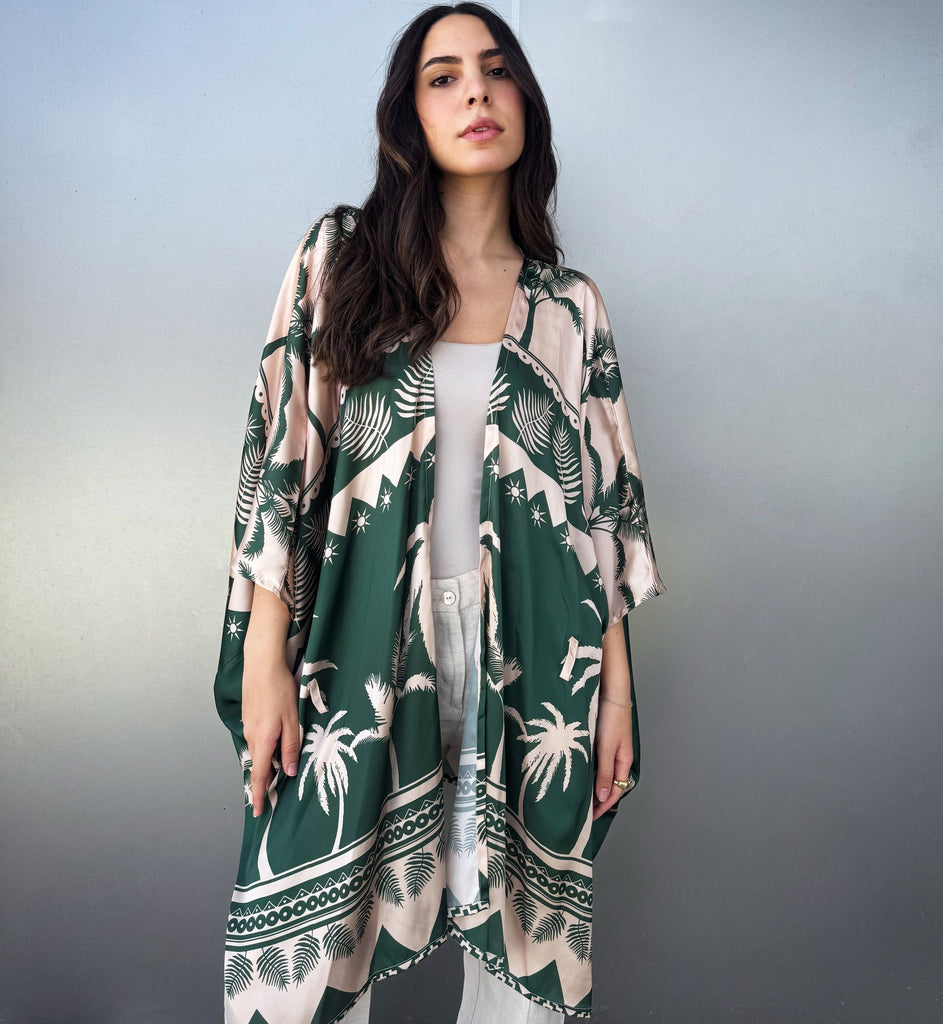 Step into glamour with our satin printed kimono, designed to turn heads wherever you go.