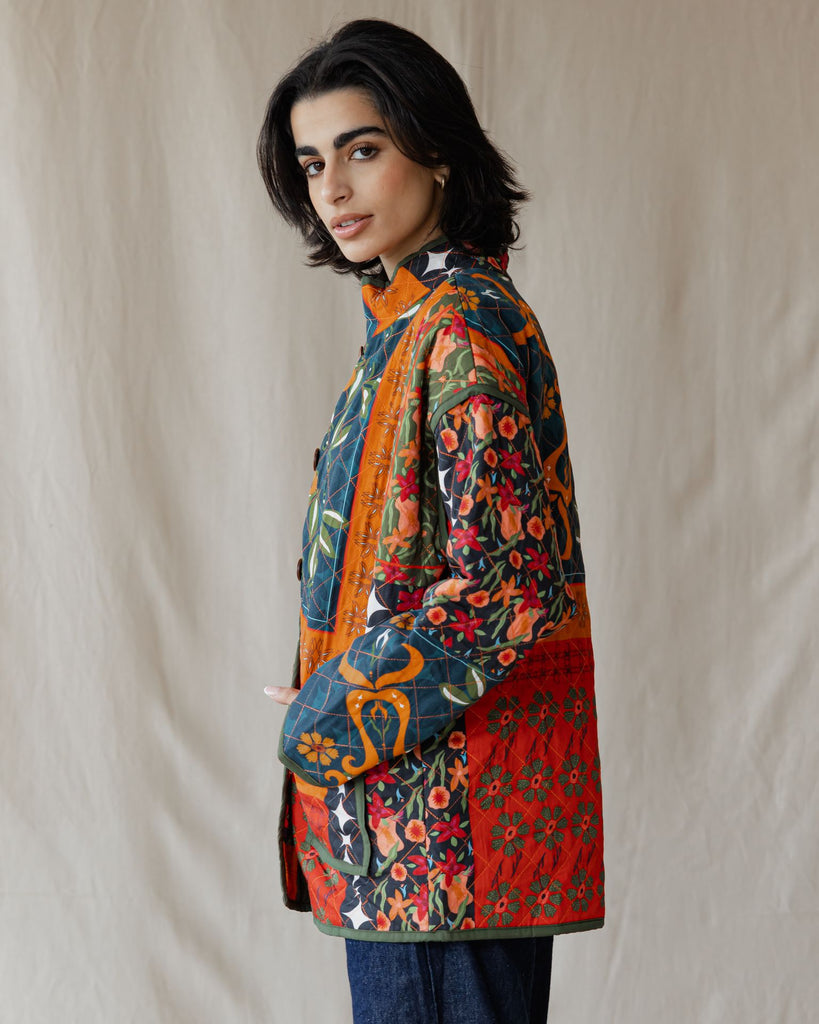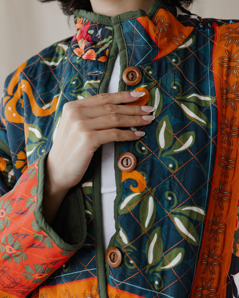 Wrap yourself in eco-friendly luxury with our organic oversized quilted jacket. The 100% cotton exterior and 100% viscose lining ensure both comfort and sustainability. The addition of a trendy print and wooden buttons elevates this jacket to a fashionable and conscious choice for any occasion.