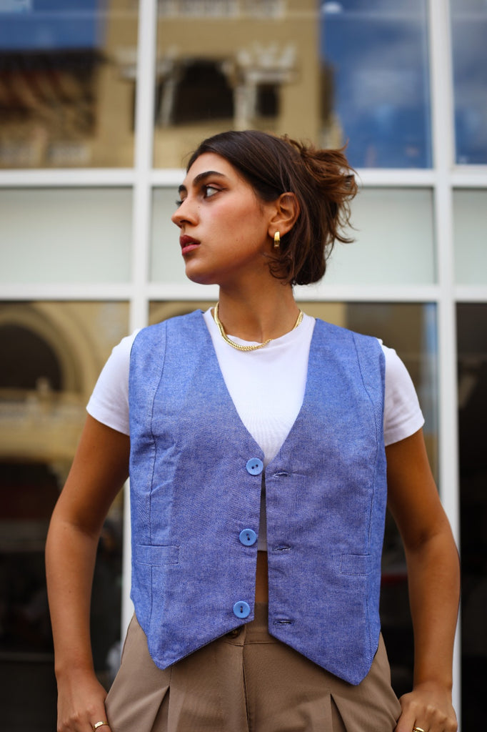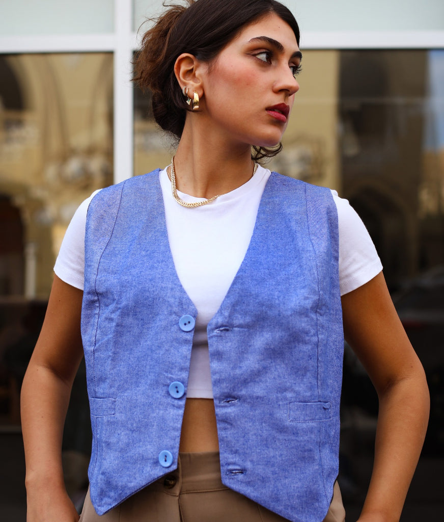 Our V-Neck cotton vest, inspired by classic suit vests, offers versatility and style. The button-up front and false welt pockets on the front add a touch of elegance, while the adjustable strap with a buckle on the back ensures comfort and customization. Whether for formal occasions or adding a polished touch to your everyday attire, this refined cotton vest is a stylish choice and a perfect addition to your wardrobe.