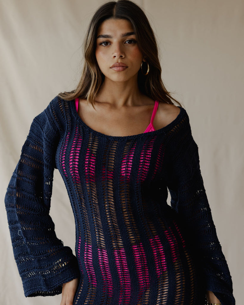 Handmade with care, this stylish crochet dress features an open-work knit and long sleeves for a unique, comfortable look. Perfect for layering or wearing on its own.