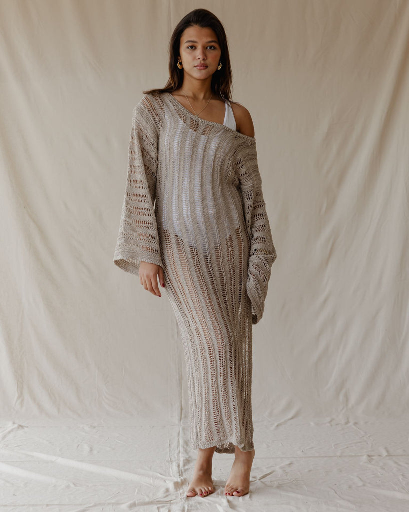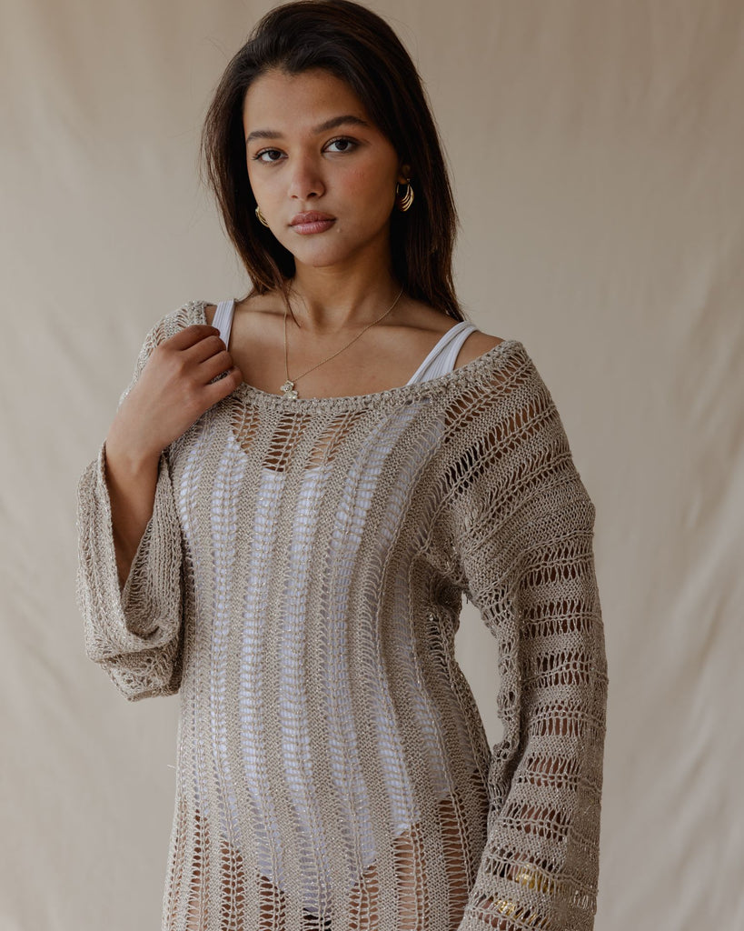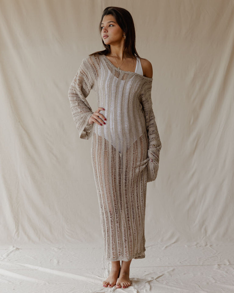 Handmade with care, this stylish crochet dress features an open-work knit and long sleeves for a unique, comfortable look. Perfect for layering or wearing on its own.