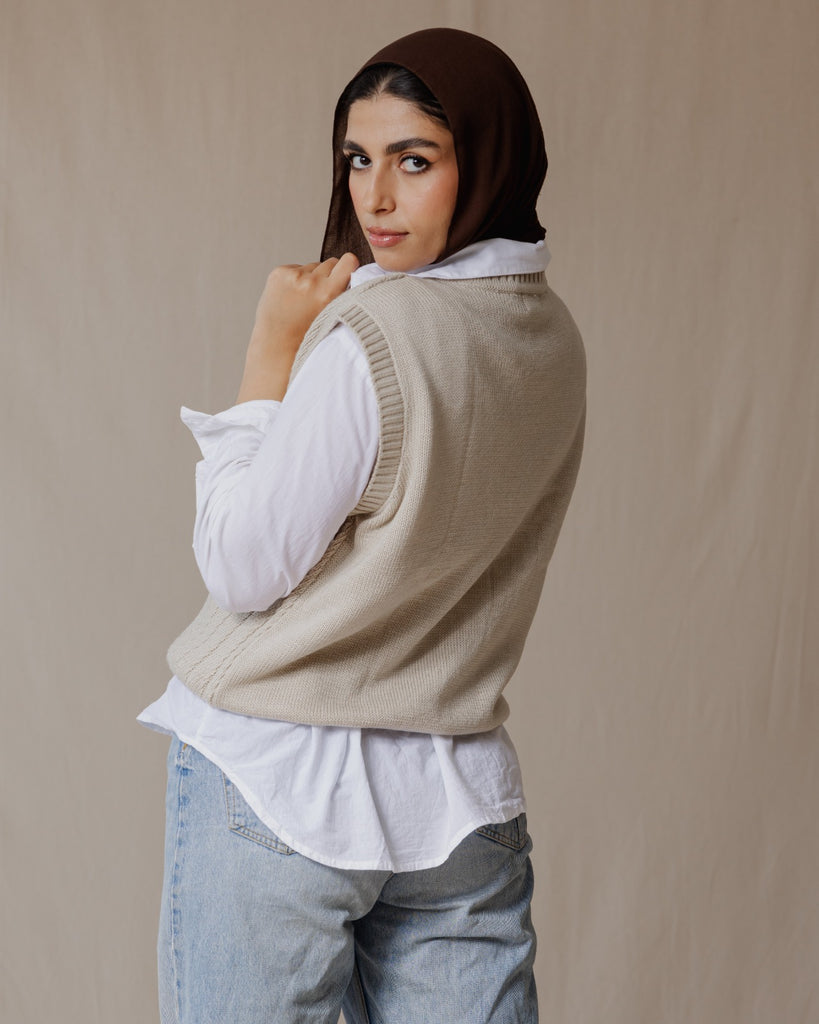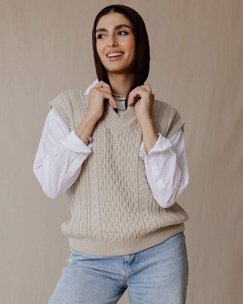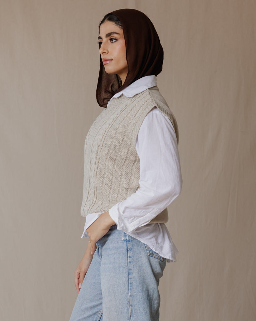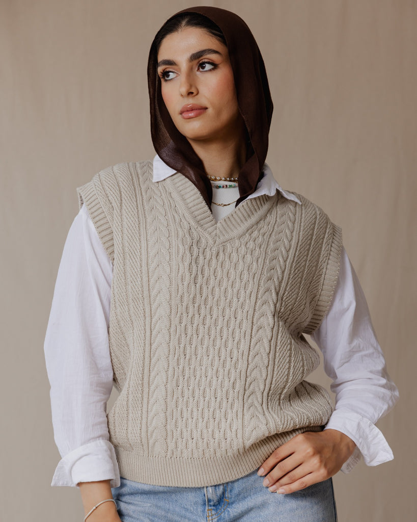 Soft tricot vest with a classic cable knit design. Solid color, stylish, and easy to layer.