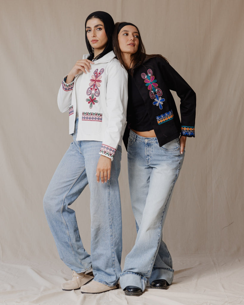 This gabardine jacket features vibrant Suzani-inspired floral embroidery on the front, cuffs, and pockets. A bold, artistic piece that adds elegance and character to any outfit.