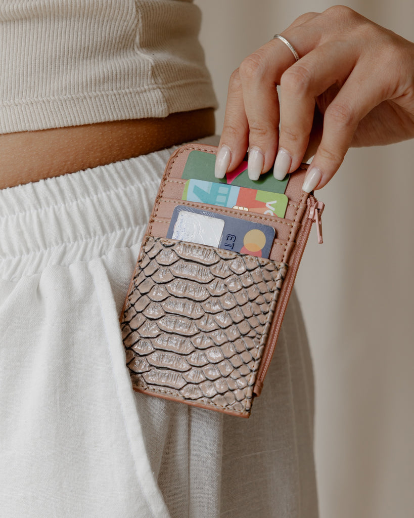 Porte-cartes en peau de serpent rose