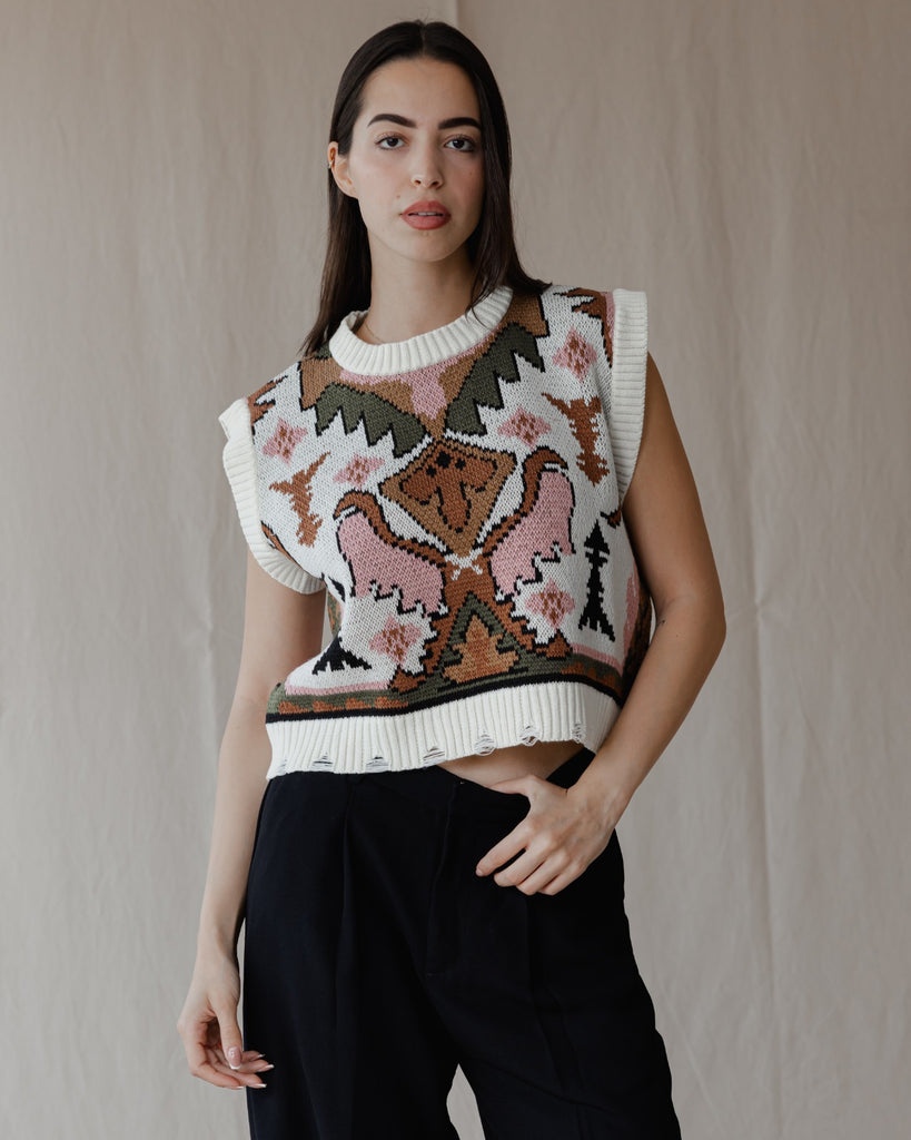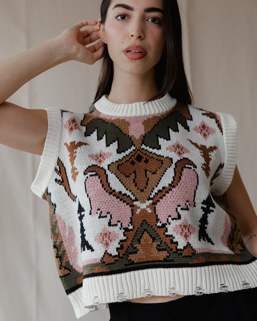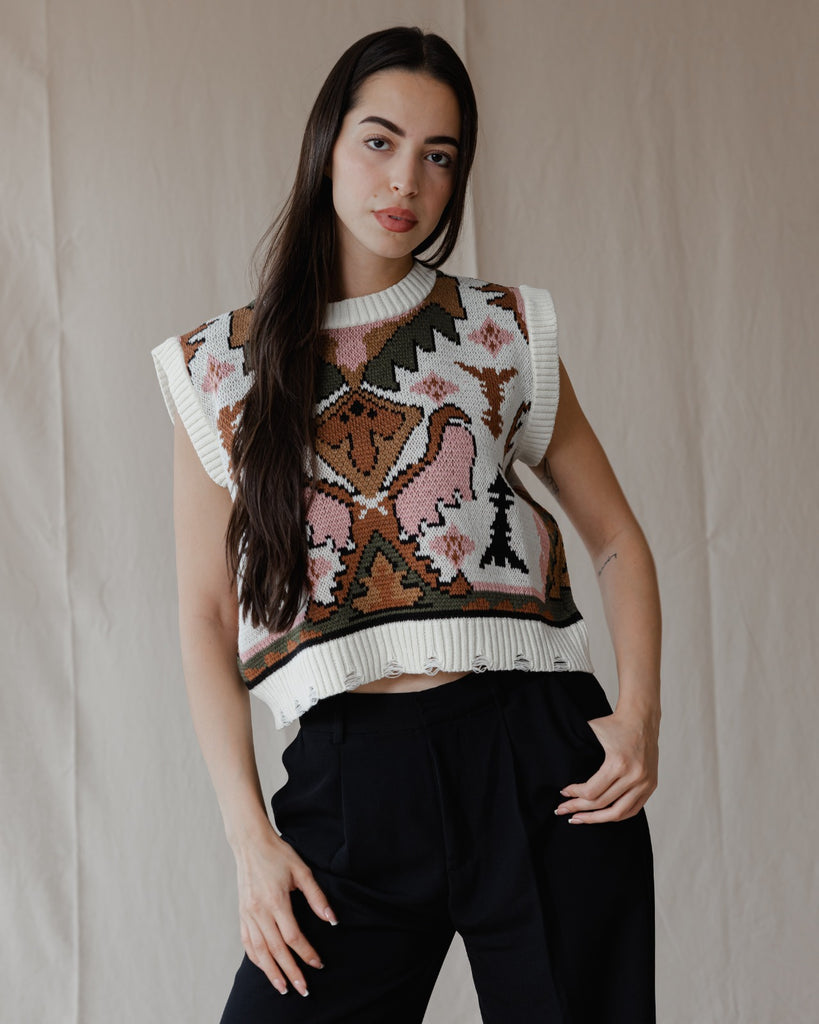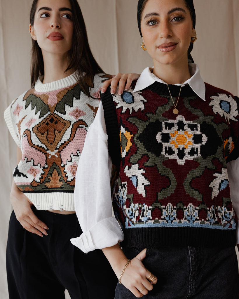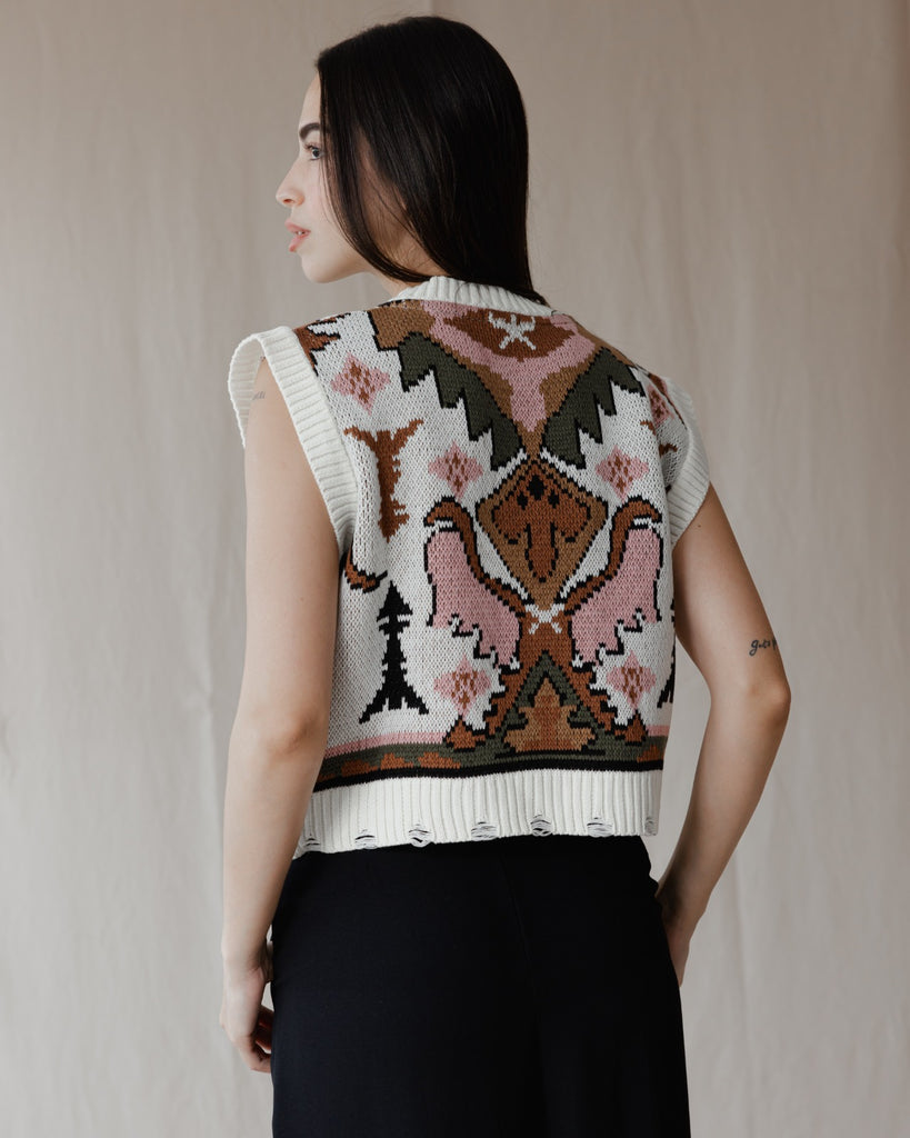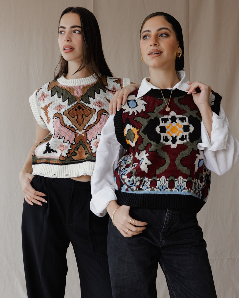 Inspired by traditional motifs, this knitted vest combines a striking pattern with warm, earthy colors. Pair it with a simple tee or layer it over a shirt for a look that’s both timeless and contemporary.