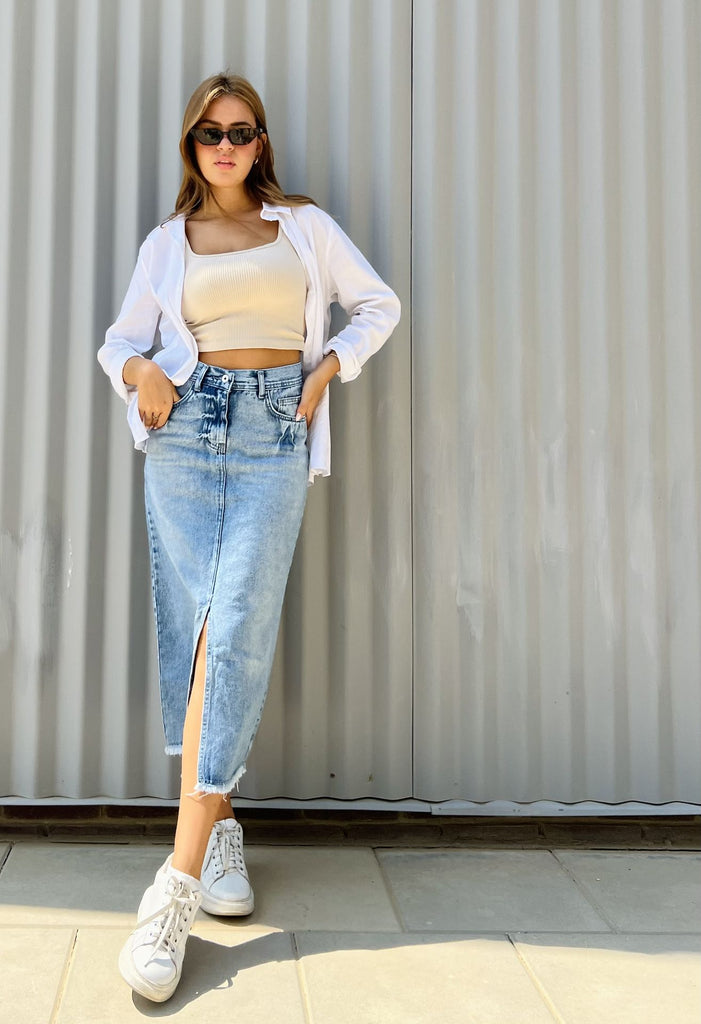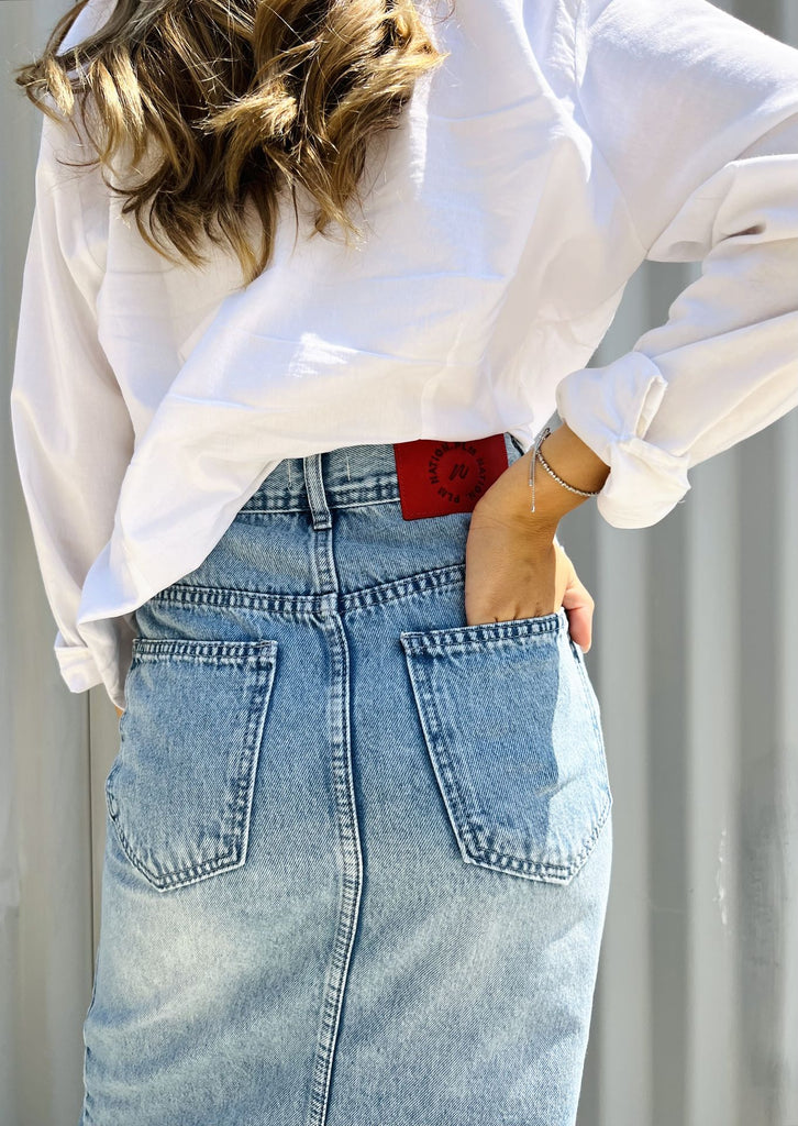 Introducing our must-have denim skirt from the PLM Nation collection. With a trendy slit and edgy detailing, it combines youthful style with a modern twist. Crafted from durable denim, this skirt offers versatility and durability for everyday wear. Step into the fashion-forward world of PLM Nation and make a statement with this denim skirt, expressing your unique personal style.